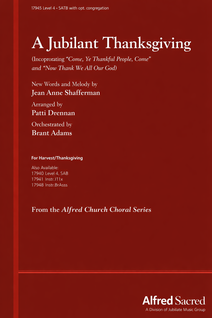 A dynamic new anthem for harvest or Thanksgiving! With text inspired by the psalms, the lively, syncopated melody incorporates references to Come, Ye Thankful People, Come. The majestic finale includes a verse of Now Thank We All Our God with congregational singing. Smaller choirs will enjoy the solo trumpet obbligato (opt., part included). Larger choirs will thrill to Brant Adams' orchestration (opt. InstruPax and InstruTrax CD available separately).