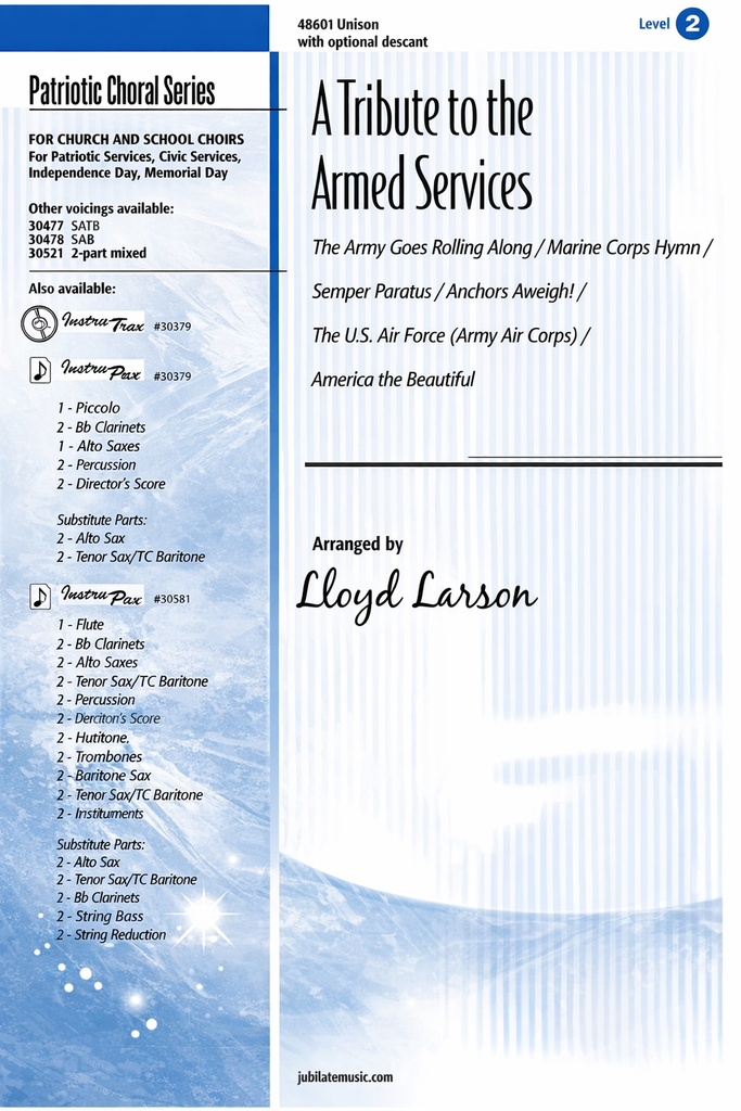 This best-selling anthem has become a staple in many repertoires! A Tribute to the Armed Services is the original complete medley of official U.S. Military songs/hymns. Using The Army Goes Rolling Along, Marine Corps Hymn, Semper Paratus (Coast Guard), Anchors Aweigh (Navy) and The U.S. Air Force, Lloyd has created the ultimate hymn of patriotism and homage to our service men and women past and present. Incorporating America the Beautiful as the finale, this medley is ideal for any patriotic service, including Independence Day, Memorial Day, Veteran's Day, and civic/school programs. Available in a wide variety of voicings making it accessible to all choirs.